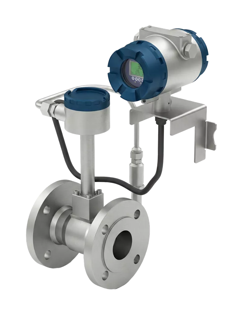 Vortex flowmeters measure flow by counting the frequency generated by the sensor (piezoelectric element) inside the device, calculating the flow rate from the measured velocity using mathematical formulas. These measured frequencies are proportional to the flow rate. Pressure and temperature data are used in the calculation because they directly affect density, especially in mass flow measurement of gases. For applications where these two values vary, compensated models are preferred; they calculate the changing density and ensure accurate flow measurement.